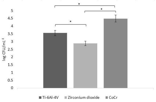 Biofilm formation (in colony-forming units (log CFU/mL-1)) on the surfaces of different biomaterials. Error bars represent the pooled standard deviations of the mean (n = 5). The level of significance was preset at * p = 0.05. The mean and standard deviation are shown.