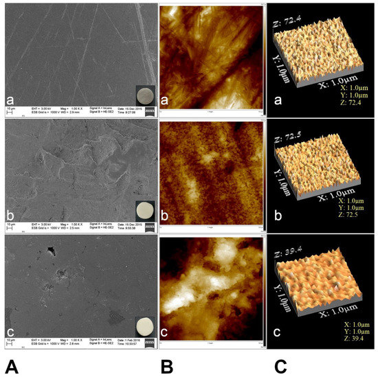 (A) Scanning electron microscopy (SEM) micrographs. Representative SEM images of the different biomaterial specimens. In all cases, the examined disks generally exhibited a smooth surface topography, with some fine polishing marks homogeneously distributed over the surface. (a), Ti-6Al-4V (grade 5 titanium); (b) zirconium dioxide (yttria-stabilized tetragonal zirconia polycrystals-3Y-TZP); (c) cobalt-chromium (CoCr) alloy (Duceralloy C). Original magnification ×1000 (Scale bar = 10 μm). (B) AFM micrographs show the surface topography of the tested biomaterials (a), Ti-6Al-4V; (b) zirconium dioxide; (c) cobalt-chromium (CoCr) alloy. Calibrated to 225 μm2 sample surface. (C) 3D atomic force microscopy (AFM) images for (a) Ti-6Al-4V; (b) zirconium dioxide; (c) cobalt-chromium (CoCr) alloy.