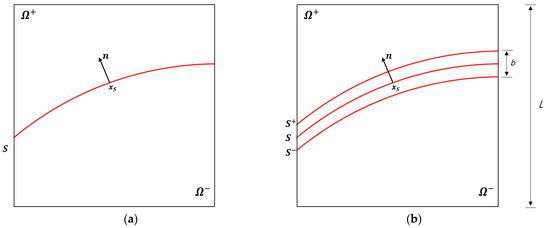 For the analysis of strain localization in the continuum setting and also for its numerical verification using FEM, it is convenient to consider a regularized discontinuity, as shown in Figure 1b. Here, subdomains and are separated by a regularized discontinuity band of finite width b, as the distance between surfaces and ; these are weak (strain) discontinuities. The bandwidth b is small compared to the characteristic size of the domain L, so that .