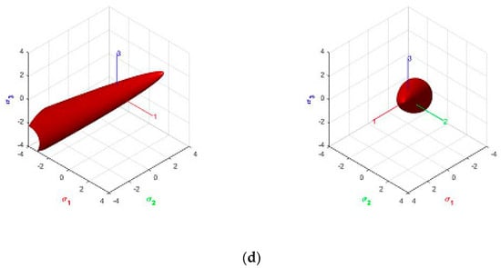 Orthotropic criteria cannot be represented graphically in the Haigh–Westergaard (HW) stress space because they depend on the six stress components. A partial graphical representation can be obtained by considering them projected into the HW space when the principal stresses act on the material axis, that is, no shear stress appears on the material system. Such representation, generally as an elliptic paraboloid, is offered in Figure 3. All strengths are scaled to 1. Figure 3a shows an orthotropic Hill cylinder, with , tensile and compresive strenth are equal. Figure 3b show the isotropic parabolic Drucker–Prager for compressive to tensile strength ratio . Figure 3d,c show the orthotropic Hoffman and Tsai–Wu criteria, respectively, for ratios and all tensile strengths are taken equal to 1.