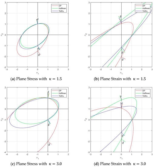 Hill [1,2,3], a pioneer in the mathematical research of plasticity, proposed several constitutive orthotropic plasticity models for sheet metals and investigated strain localization and failure of orthotropic plastic materials. Based on Hill’s works, many isotropic and orthotropic plastic criteria have been later proposed, such as the Drucker–Prager model [4,5,6,7], Hoffman model [8], Tsai–Wu model [9], and many more [10,11,12]. Purely cohesive models that are insensitive to pressure and yield an isochoric plastic flow, such as the von Mises and the Hill models, are appropriate for metallic materials. Associated elasto-plastic cohesive–frictional models such as the Drucker–Prager, Hoffman and Tsai–Wu models are suitable for simulating polymeric materials such as PVC H100, H250 and carbon fiber composites [13,14,15,16] with isotropic and orthotropic behavior, as these materials show distinct strengths under tensile and compressive loading. Additive manufacturing techniques based on filament deposition or powder bed fusion introduce different levels of orthotropy in the mechanical stiffness and strength of the fabricated components. Geomaterials like soils, concrete, masonry and rocks are also modeled with pressure-sensitive plasticity models; non-associated plasticity is also used for these materials in order to better approximate the real dilatant behavior.