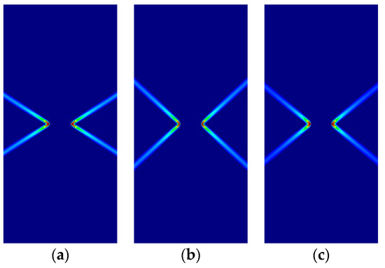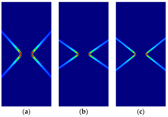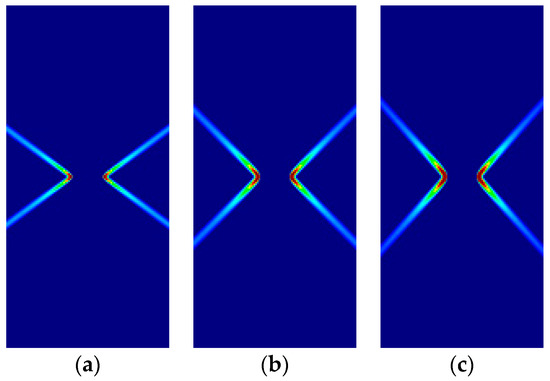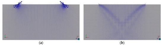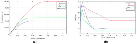 It can be verified that this stress redistribution during the formation of the slip lines occurs precisely as dictated by the strain localization condition. This is done in Table 12 by comparing the value , measured directly from Figure 16, with the value , obtained by applying the analytical condition (Section 3.3.2 and Section 3.5.2) to the numerically obtained values for the stresses. The correspondence between both value is remarkable.
