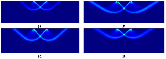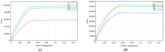 Stresses of the slide lines of Prandtl’s punch test (Plane Strain, ): (a) von Mises; (b) Parabolic Drucker–Prager; (c) Hoffman; (d) Tsai–Wu.