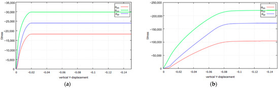 Several remarks are in order: (a) the extension of the transition phase largely differs from one case to the other; it is shorter for von Mises and longer for Drucker–Prager; (b) due to increasing vertical loading, the out of plane develops due to the plane strain constraint; (c) concurrently, the in-plane horizontal also develops, very much depending on the yield criterion; this later development shows the frictional and/or orthotropic nature of the plastic behavior.