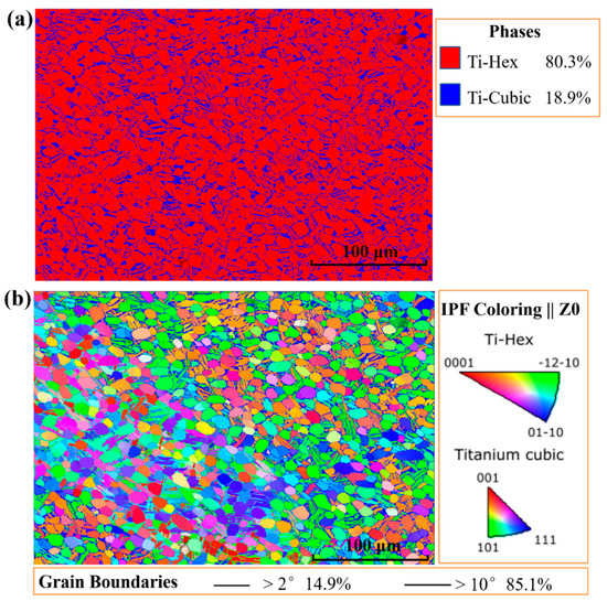 The electron backscattered diffraction (EBSD) analysis of the as-received dual-phase Ti alloy, (a) phase map; (b) the coupling analysis of inverse pole figure and the grain boundary map.