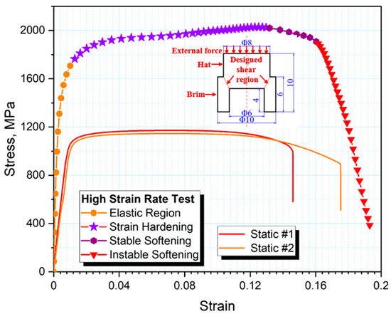 The stress–strain of dual-phase Ti alloy at the strain rate of 1.8 × 104 s−1 and the static one (0.001 s−1) together with the geometry of the hat-shaped specimen.