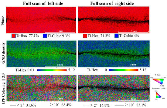 Figure 4 shows the full scans of the ASBs and the corresponding affected zones in terms of the phase map, the geometrically necessary dislocation (GND )map, and the coupling analysis of inverse pole figure and grain boundary map (IPF+GB). Different plastic strains between the left and the right sections may also yield different microstructure evolutions. In the phase maps, the estimated amounts of β phase decreased to less than 10%, which also indicates that the dominated shearing path was along the α/β phase boundaries, which caused the β grains within the elongated and the recrystallized extremely fine α grains to be indistinguishable. Dynamic recrystallization yielded a large amount of fine α grains dispersed along the shearing paths and in the ASBs, which could contribute to the formation of textures. It is understood that recrystallization is dominated by the entropic effect arising from the competition between the formation of dislocation and that of grain boundaries while the shear band instability emerges, which is attributed to the thermal heating occurring faster than heat dissipation [39]. Moreover, the thickness of the ASB-affected regions resulting in the collaborating plastic deformation was clearly captured by GND mapping. It seems as if the low-angle grain boundaries of the left side presented a good resistance to the formation of cracks and the thermal softening. The grain boundaries with high angles within the ASBs were also geometrical necessary boundaries, which is the same as previous observations in pure Ti [40]. In line with the grain boundary complexions [41,42,43], it is understood that free volumes exist at the boundaries, constructing the weakly bonded regions and contributing to the initiation of ASBs. Furthermore, the slip systems highlighted in red in the IPF maps play an important role in the formation of ASBs, which is validated by the following theoretical analysis.