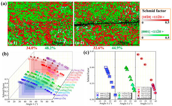 During shock loading, uncommon slip systems might be activated. In general, plastic deformation initiates on the crystallographic plane with the highest Schmid factor when the stress resolved on that plane in the slip direction reaches a critical value. Based on the experimental analysis of Schmid factor, as shown in Figure 5 and Figure 6a,b, the basal and the prismatic slips mediated by and are the dominated slip systems. Therefore, the physical reasons for the selection of these two slip systems are essential, which can also verify whether the Schmid law breaks down. Under the condition of , the SF of a given slip direction <a,b,c> can be screened comprehensively. As displayed in Figure 6c,d, although the pyramidal slip systems have the largest SFs compared with those of basal and prismatic ones within the low angle ranges, they are difficult to activate because of the requirements of the largest critical resolved shear stress and the rotations of deformed grains. On the contrary, in the range of 25~35°, the basal and prismatic slips are the dominant approaches since both of them have the larger SFs, matching well with the present experimental observations. Since non-basal slipping enhances both the strength and ductility of an HCP structure [45], the prismatic slips dramatically contribute to the aforementioned strain hardening. Finally, it is highlighted that the Schmid or the non-Schmid behaviors of the materials should be comprehensively investigated, revealing the variations in critical resolved shear stress and the selections of deformation model [18,26,46], providing the promising strategies to enhance damage tolerance properties.