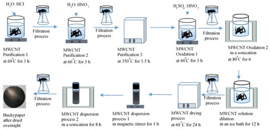 A schematic diagram of the unheated buckypaper preparation process via the wet method is shown in Figure 1. MWCNTs (0.5 g) were added to HCI (96%) with deionized (DI) water of 1:1 and then dispersed via mechanical stirring at 60 °C for 3 h to obtain a uniform solution. The purified MWNTs were filtered through a microporous membrane filter (pore size 0.45 μm) using filtration units with a vacuum pump and later washed until the pH of the solution was around 7. Subsequently, the second step of purification was performed, and the process was repeated for HNO3 (65%) with DI water (1:3 ratio) at 60 °C with magnetic stirring for 3 h instead of the previous process. The first two stages of purification were performed using HCI and HNO3 acids to remove metallic impurities that may form during MWCNTs production, followed by heat treatment to remove amorphous carbon after acid purification. The heat treatment process was continued at 350 °C for 2 h. Oxidation continued after the purification process. Concerning the use of CNTs as reinforcements in composite materials, the incorporation of oxygen-containing functionalities onto the graphitic surface is crucial for improving interfacial adhesion, i.e., the unique mechanical and electrical properties of CNTs can be transferred to the properties of CNT-based composites [14,15]. The oxidation process begins after the purification process. The oxidation process is a chemical reaction that combines oxygen-containing carboxyl groups in the MWCNT structure under the action of nitric and sulfuric acids, a mixture of strong acids, and combines the action of ultrasonic with heat to activate the reaction. The oxidation process took place in two stages, first, the purified MWCNTs were dispersed in 1:3 solutions of HNO3 (65%) and H2SO4 (98%) by using an ultrasonic bath with 60 °C for 6 h. After that, the resulting product was kept on the heater with a magnetic stirrer for 3 h. Then, the oxidized product was cooled thoroughly, and water was added until the volume increased 3 times, after which the soil was placed in an ice bucket and stored for 12 h. The oxidized MWNTs were filtered through a microporous membrane filter using filtration units and subsequently washed until the pH of the solution was around 7. The oxidized MWCNTs were dried in an oven at 60 °C for 24 h. The oxidized MWCNTs were subsequently dispersed in water, first by magnetic stirring for 1 h, followed by an ultrasonic bath for 3 h. To obtain a dense structure of MWCNTs, MWCNT dispersion was performed without heating, and the experimental temperature was con-trolled up to 25 °C. Subsequently, the resulting product was filtered and later dried for 24 h at room temperature. The next day, the resulting product was peeled off from the filtration membrane, and the resulting product is called buckypaper [14,15]. The thickness of the experimental buckypaper was adjusted to 17 μm, and the density was around 2.8 g cm−1.