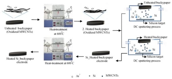 A schematic diagram of the preparation process is shown in Figure 2 For the heated buckypaper electrode; the unheated buckypaper was heat-treated at 600 °C for 1.5 h in a vacuum-sealed quartz tube. For the HSi_HBP electrode, a-Si thin film was deposited on heated buckypaper substrates via DC magnetron sputtering. The Si thin film was deposited at room temperature, the base pressure in a vacuum was 5 × 10−6 Torr, and the deposition pressure was maintained at 2 × 10−3 Torr. The Ar gas flow rate was 20 sccm, and the deposition rate of the film was 20 nm/min. The Si target was pre-sputtered for 15 min, and the deposition time was 15 min at 200 W DC power. Regarding the HSi_HBP electrode, before commencing the coating process, the unheated buckypaper was heat-treated at 600 °C for 0.5 h in a vacuum-sealed quartz tube. Subsequently, the Si thin film was deposited with the heated buckypaper under the same sputtering conditions. Next, the Si thin film on the HBP electrode was reheated at 600 °C for 1 h in a vacuum-sealed quartz tube after the Si sputtering process.