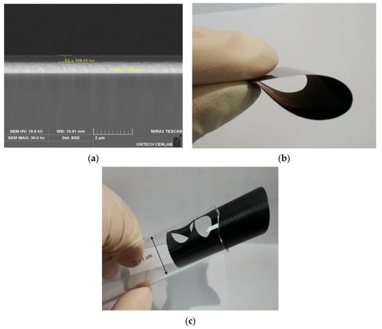 Figure 3. Cross-sectional view of (a) Si deposited on the titanium and photograph of free-standing flexible (b) UBP and (c) HBP being rolled (3 × 3 mm2).