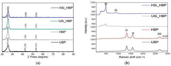 Figure 5. (a) XRD patterns and (b) Raman spectra of UBP, HBP, Si_HBP, and HSi_HBP electrodes.