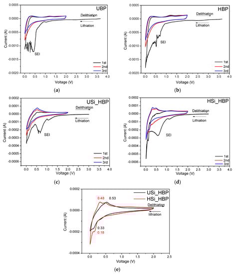 Figure 6. The cyclic voltammograms of (a) the UBP, (b) HBP, (c) USi_HBP, and (d) HSi_HBP electrodes; (e) third CV curves of both Si electrodes at a 0.1 mV s−1 scanning rate between 0.01 and 2.0 V.
