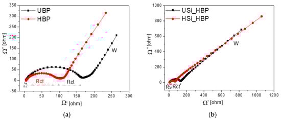 Figure 7 shows a comparison of the Nyquist plots of the electrodes to provide a better understanding of the charge transfer and ion transfer mechanism of the electrodes. The Nyquist plots were obtained at a frequency range of 1 MHz to 10 mHz with 0.15 V in the discharged state at the fifth cycle. The Nyquist plot exhibited a suppressed semicircle in the high-to-medium frequency region and a diagonal straight line at low frequencies; the former is ascribed to charge transfer, whereas the latter is attributed to the lithium-ion diffusion of the electrode material [41,49,50]. The Nyquist plots show solution resistance (Rs) from zero to the beginning of the semicircle and charge transfer resistance (Rct) up to the end of the semicircle [51]. As shown in Figure 7a, the solution resistances were similar, i.e., 6.3 Ω for the UBP and 4.3 Ω for the HBP electrode, whereas the semicircle radius of the HBP electrode (Rct = 101 Ω) was much smaller than that of the UBP electrode (Rct = 169 Ω). These curves demonstrate that the impedance in the electrode decreased, the insertion and delithiation of Li ions became easier, and the electrochemical performance improved [21]. Based on the Si electrodes shown in Figure 7b, the diameter of the semicircle of the HSi_HBP (63 Ω) was smaller than that of the USi_HBP electrode (125 Ω), indicating a much lower cell impedance. This lower impedance enabled the cells to decrease their polarization and maintain stable electrochemical states in terms of cycle stability and rate capability [45,49,51]. The reaction mechanism of lithiation and delithiation of a single buckypaper electrode differs from that of a silicon-coated buckypaper, and in this study, the capacity of the electrodes is expressed in milliampere-hours.