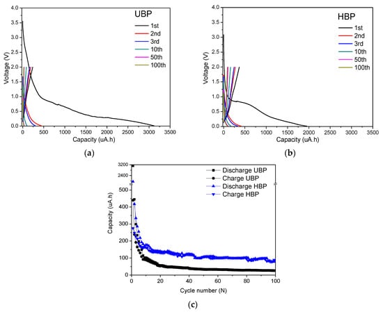 Figure 8. Charge/discharge capacity profile of (a) UBP and (b) HBP; discharge and charge cycling performance of (c) buckypaper electrodes with a current density of 125 μA and cutoff voltage of 0.01–2.0 V.