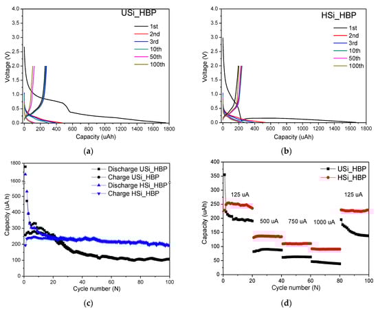 Figure 9. Charge/discharge capacity profiles of (a) USi_HBP and (b) HSi_HBP, (c) discharge/charge cycling performance of electrodes at a current density of 125 μA with the voltage of 0.01–2.0 V, and (d) charge cycling performance of heat-treated Si electrodes at progressively increasing current densities from 125 to 1000 μA.