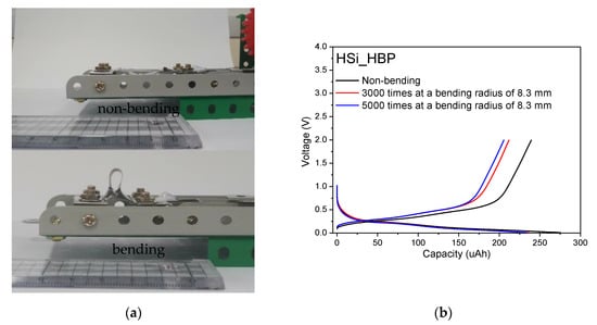Figure 10. Bending-state electrochemical testing of HSi_HBP electrodes. (a) Photograph of bending test for 8.3 mm radius at two different durations; (b) Charge/discharge capacity profiles of electrodes at a current density of 125 μA with the voltage ranges of 0.01–2.0 V.