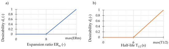 The first method based on the principles of simultaneous optimization of multiple variables, utilized desirability functions for computing desirability indices, described in detail in [44,45,46,47]). This method permitted the identification of bitumen temperatures and foaming water contents at which the expansion ratios and bitumen foam half-lives simultaneously reached the highest values. The formulation of the desirability functions used in this study is shown in Figure 2. The presented criteria were adopted after [48], as they are relatively liberal among those proposed in the literature [7,48,49,50]. To this date, there are no unequivocal recommendations on bitumen foamability for warm mixes [27,40]. The desirability indices were calculated as a geometric mean of the values of desirability functions as in [47].