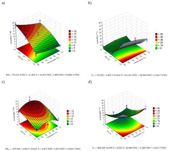 The results of the evaluation of foaming performance of the discussed bituminous binders are presented in Figure 3. The graphs represent the response surfaces plotted based on the statistical models, which were fitted to the test data.