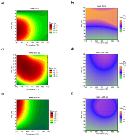 The results of the additional analyses for evaluating the foaming performance are presented in Figure 4. Regarding the 50/70 paving grade bitumen it was found that the highest ERm and T1/2 were simultaneous achievable at lower temperatures (<155 °C) and in the range of 1–2% of foaming water content. At the same time, the equality of the foaming characteristics was found in the 1.6–1.8% FWC range throughout the temperature range. The 45/80-55 bitumen has exhibited the highest foamability in the middle of the temperature and foaming water ranges (Figure 4c), which at T = 155 °C and FWC = 2% also resulted in the balance of ERm and T1/2 values. As for the HMB 45/80-80 binder, the analysis has shown that highest foamability was achieved at the lowest foaming temperature of 155 °C and high FWCs in the range of 2–3%. This effect was due to exceptional T1/2 values in the whole experimental domain and simultaneously high sensitivity of ERm to changes in temperature and foaming water contents. The obtained equality region of ERm and T1/2 in the HiMA binder was similar to that recorded for the PMB binder.