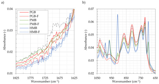 Figure 5 presents sample ATR-FTIR absorbance spectra of the tested PGB, PMB and HMB bitumen before and after foaming (annotated by “-F”). These spectra are supplemented by the results obtained by probing the PGB binder after RTFO aging (annotated by “-RTFOT”) to compare the effects of controlled oxidative stress induced by short-term ageing. Figure 5a shows the 1700 cm−1 wavenumber region, associated with the formation of carbonyl structures during oxidative aging. Figure 5b depicts the sulfoxide region (1030 cm−1) together with the peaks indicative of SBS polymer presence in the bitumen.