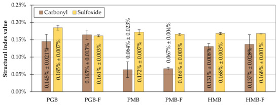 In the case of all investigated binders, the changes in mean values of the carbonyl and sulfoxide indices induced by bitumen foaming were small, both in absolute terms as well as in relation with the recorded standard deviations. The carbonyl indices tended to increase after foaming, whereas the sulfoxide indices decreased slightly. The greatest differences in the measured indices were observed in the PGM binder. The statistical evaluation (Table 5) has shown that only the change of the sulfoxide index in the PGM binder (its decrease) was statistically significant.