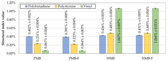 The values of the measured polybutadiene and polystyrene indices in the PMB binder indicated a typical linear SBS copolymer modification [63,64], while the values of vinyl indices in the HMB binder were characteristic of high vinyl SBS. The relatively high values of polybutadiene and polystyrene indices together with a very high vinyl index may be related to overall high SBS content, which is expected in a HiMA binder.