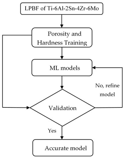 The flow diagram of the method of processing Ti-6Al-2Sn-4Zr-6Mo and the development of different ML models is shown in Figure 1.