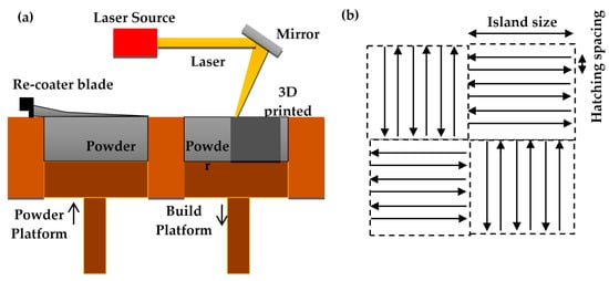 (a) A schematic diagram of the laser powder bed fusion system, (b) the island scanning and hatching spacing contours.