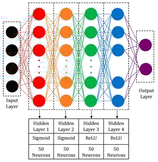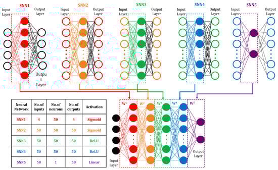 Artificial neural networks are mathematical algorithms inspired by the neural networks of animal brains. A shallow neural network (SNN) consists of one input layer, one hidden layer, and one output layer. A neural network with more than two layers is referred to as deep learning neural networks (DLNNs) []. DLNNs are more efficient than SNNs when modelling complex problems as it uses nonlinear activation functions at several layers []. The greedy layer-wise pre-training technique proves to be effective in overcoming local minima [,]. Greedy layer-wise pre-training sets the weights of a neural network to values in the neighbourhood of a local minimum. Hence, it aids the optimisation process and induces better model generalisation. A stacked auto-encoder (SAE) architecture was used as an alternative to the Boltzmann machine in a pre-training approach [].