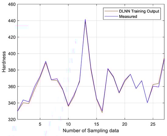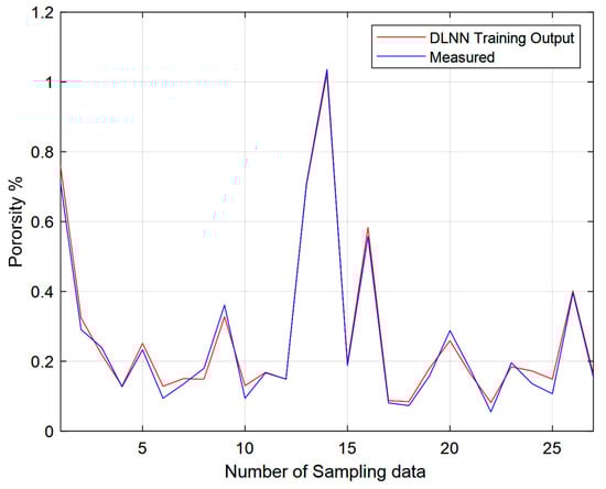 The mean percentage error results shown in Table 3 represents the model predictions using only 90% of the experimental data. For validation, a comparison between the model developed using deep learning neural network unsupervised greedy layer-wise pre-training approach and the 100% of the measured data of both the porosity and the hardness are shown in Figure 6 and Figure 7 respectively. The two figures show a strong agreement between the measured data and the DLNN model, represented by the red and the blue lines.