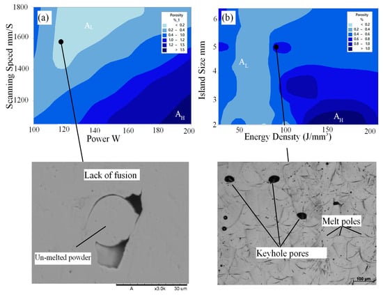 The optimised DLNN model was employed to develop a contour map of the porosity alloy with respect to the process parameters, see Figure 8. The contour distribution shows areas with the lowest and highest porosity, and they are indicated by AL and AH. Defects such as lack of fusion porosity and keyholes were detected in the microstructure of the samples. At low energy density, melt pools do not overlap, leaving unmelted powder and forms lack of fusion defects, while at high-energy input, melt pools become unstable and deepen, creating keyholes pores. It was also noted that the island size has an effect on the porosity of the sample when the energy density is high, though its original purpose was to distribute the heat energy across the part cross-section evenly and hence minimise the developed thermal stresses.
