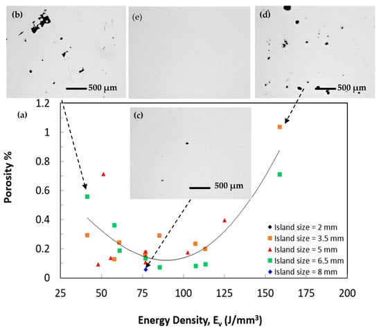 Furthermore, samples fabricated using Ev 158 J/mm3 shows the highest porosity level of 1.036% and the largest average pore diameter of 615 µm. Generally, spherical pores can be attributed to entrapped gas within the gas atomised powder particles and keyhole defects, while irregularly shaped porosity resulted from incomplete melting of the powders because of insufficient energy during the laser scanning of that area, Figure 9d. In agreement with the DLNN prediction shown in Figure 8, samples produced using an island size of 6.5 mm achieved a lower porosity than those with 3.5 mm, at the same energy density, see Figure 10. This may be because many pores are formed at the interface between islands, which means that smaller islands would increase porosity due to the increase of island interfaces. In contrast to island size, we could not find a correlation between the samples’ porosity levels fabricated using the same energy density while varying the laser power, speed, or hatching space.