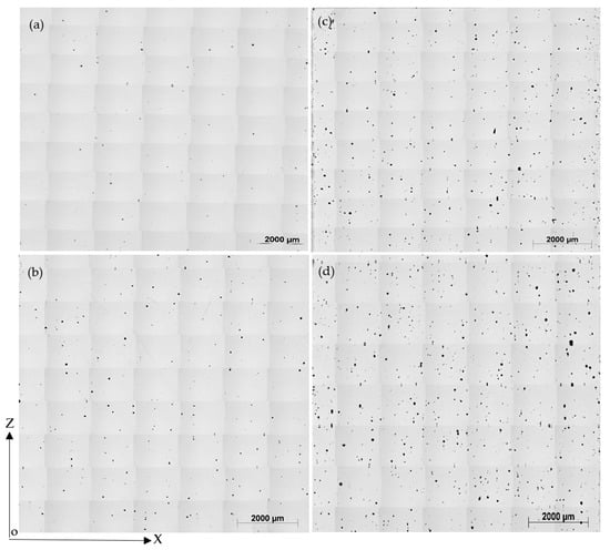 The variation of porosity level with island size for the same energy density, (a) Ev of 85 J/mm3, IS = 6.5 mm, Af = 0.07%; (b) Ev of 85 J/mm3, IS = 3.5 mm, Af = 0.29%; (c) Ev of 158 J/mm3, IS = 6.5 mm, Af = 0.71%; (d) Ev of 158 J/mm3, IS = 3.5 mm, Af = 1.04.