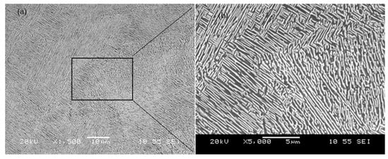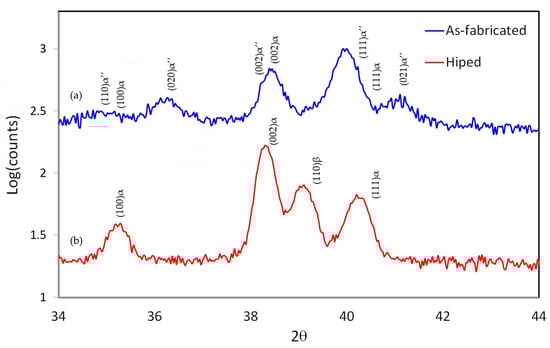 The XRD results of the LPBF and the HIPed samples are shown in Figure 11. α’’martenstic phase strong peaks while much less pronounced peaks of α can be found in the LPBF samples. The typical microstructure for a Ti-6Al-2Sn-4Zr-6Mo alloy produced using conventional techniques consists of α and β phases. The formation of the α’’martenstic phase is due to the laser energy input, which creates temperature above the β transus followed by rapid cooling. α’’martenstic phase is not an acceptable phase for industrial applications as it is brittle. Therefore, it is important to achieve a homogenous and stable microstructure as it affects the mechanical properties of a material. Controlling the microstructure can be achieved through post-processing treatments such as annealing or hot isostatic pressing (HIP). Figure 12a,b show the low and high magnification SEM micrographs of sample after the HIP post-processing. The microstructure and the XRD revealed the presence of α and β phases. The light regions are α phases, while the dark regions are the β phase. Using image analysis similar to the porosity calculation, the α phase fraction after HIP was 26.5% while the β phase was 73.5%.