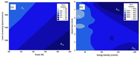 Figure 13 shows the predicted contour map of the hardness against the process parameters using the optimum DLNN model. Similar to porosity, the effect of the island size parameter was found significant to the hardness.