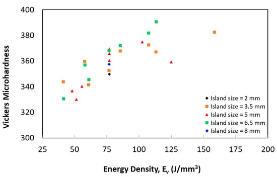 Figure 14 shows the measured hardness with respect to energy density. A notable scatter is observed in most of the measurements. Although a hardness dataset was scattered along with the energy data, the model predicted it accurately, see Figure 7 and Figure 14. The highest Vickers microhardness was found in sample 13, which was fabricated using Ev 158 J/mm3 and an island size of 6.5 mm, while the lowest Vickers microhardness was obtained in sample 1, which was built using Ev 51 J/mm3 and island size of 5 mm. It was also found that island size has a contribution to the hardness measurement fluctuation of the samples fabricated using similar energy input, which may be attributed to the variation of the porosity content. This agrees with the predicted DLNN model, as shown in Figure 14. Samples fabricated using an island size of 6.5 mm achieved a higher hardness than those with 3.5 mm, at Ev > 61 J/mm3.