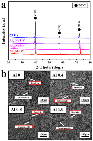 Figure 1a shows the X-ray diffraction (XRD) patterns of the as-cast AlxNbTiV (X = 0, 0.4, 0.8, and 1) alloys.