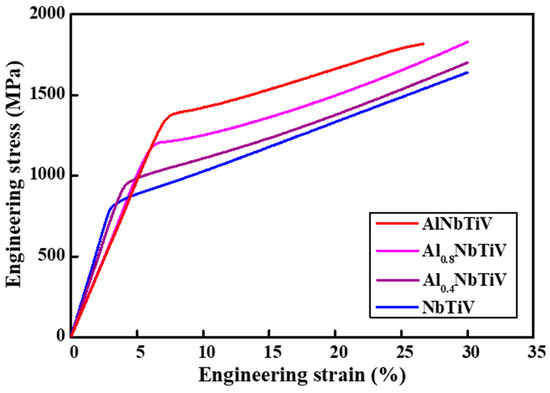 The compressive stress–strain curves of the as-cast AlxNbTiV (X = 0, 0.4, 0.8, 1) alloys at room temperature with a strain rate of 10−3 s−1 are shown in Figure 2.