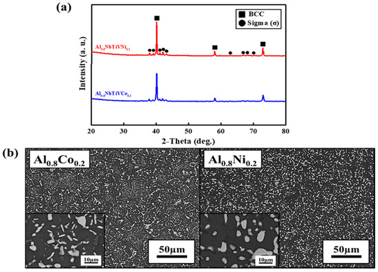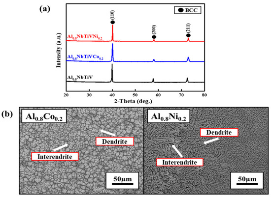 Figure 3a shows the XRD patterns of the as-cast Al0.8NbTiVM0.2 (M = Co, Ni) alloys.