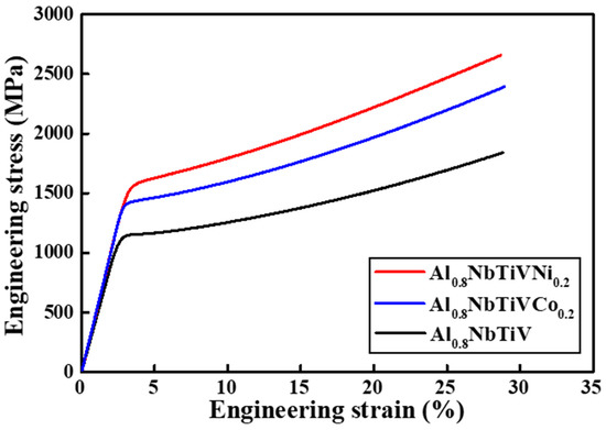 The compressive stress–strain curves of the as-cast Al0.8NbTiVCo0.2 and Al0.8NbTiVNi0.2 alloys at room temperature with a strain rate of 10−3 s−1 are shown in Figure 4.