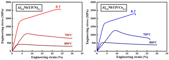 The elevated temperature compressive tests were performed up to 800 °C at a strain rate of 1 × 10−3 s−1 for the heat-treated Al0.8NbTiVCo0.2 and Al0.8NbTiVNi0.2 alloys, as shown in Figure 6.