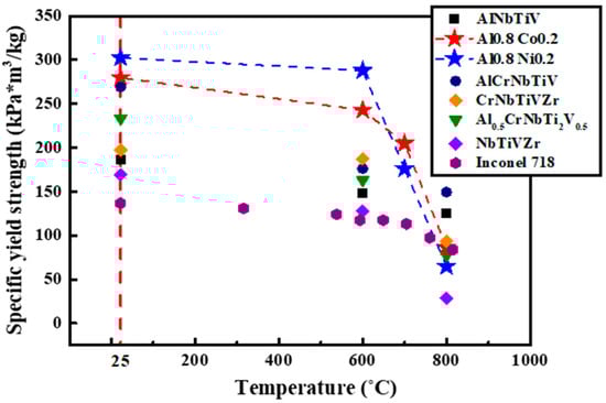 For the comparison, the SYS of the AlNbTiV, AlCrNbTiV, CrNbTiVZr, NbTiZrV, and Al0.5CrNbTi2V0.5 HEAs and Inconel 718 are also included [17,19,23,36]. Note that the SYS of the Inconel 718 alloy was obtained in tension. The addition of Co or Ni into the Al0.8NbTiV alloy results in the increase of the SYS as compared to the AlNbTiV HEA. It is observed that the SYS of the Al0.8NbTiVCo0.2 and Al0.8NbTiVNi0.2 alloys are higher than other alloys at temperatures up to 700 °C, while further increase of the temperatures induces a dramatic decrease of the SYS, to 86.65 and 64.79 kPa*m3/kg, respectively. Compared to Inconel 718, which is widely used for high-temperature applications, the present Al0.8NbTiVM0.2 (M = Co, Ni) alloys possess higher yield strength at elevated temperatures up to 700 °C.