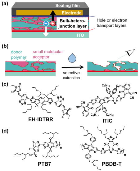 One of the important breakthroughs that has contributed to the improvement of PCEs is the utilization of a bulk-heterojunction (BHJ) structure composed of mixed donor polymers and small molecular acceptors as the active layer of OSCs, which can achieve a large donor-acceptor interface area to generate a high photocurrent (Figure 1a) [8,9,10]. The microstructure of the BHJ layer can strongly affect the photovoltaic properties. The key to improving photovoltaic performance is to develop a BHJ film with as large a donor-acceptor interface area as possible, thereby establishing pathways for electron and hole carrier transport to the upper and lower electrodes [11,12,13]. To fabricate an effective BHJ structure in films with the above features, detailed analyses of BHJ film microstructures are imperative to yield efficient OSCs with high photovoltaic performance. To this end, X-ray measurement, electron microscopy, and other special measurements are usually used. However, these analytical methods are not readily accessible, and observation of BHJ film microstructures is generally difficult. To study the BHJ layer microstructure, the selective extraction method [14,15] has been adopted, by which donor polymer-only films are obtained after the extraction of small molecular acceptors from the donor/acceptor blend films (Figure 1b). Using this method, the morphology of donor materials in BHJ films can be easily observed by atomic force microscopy (AFM). Moreover, we have approximated the morphology of acceptor materials by analyzing the pores in the extracted films [14]. We found that the selective extraction method of fullerene-based acceptors and subsequent AFM observations are effective for the detailed analysis of BHJ films and yield useful knowledge regarding BHJ films composed of fullerene-based acceptors. On the other hand, recently developed OSCs with high PCEs are composed of nonfullerene acceptors (NFAs) [16,17,18] and donor polymers with benzodithiophene units [19,20,21]. We are interested in clarifying the morphology of BHJ films in NFA-based OSCs by utilizing the selective extraction method and subsequent AFM analysis.