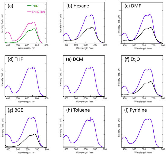 Absorption spectra of thin films of PTB7 and EH-IDTBR (a) and spectra obtained after extraction of EH-IDTBR from blend films (before: purple, after: black) using various organic solvents (b): n-hexane, (c): DMF, (d): THF, (e): DCM, (f): Et2O, (g): BGE, (h): toluene, (i): pyridine.