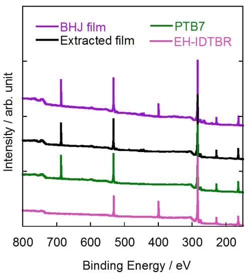 XPS spectra of BHJ films before and after extraction and of pure films of PTB7 and EH-IDTBR.