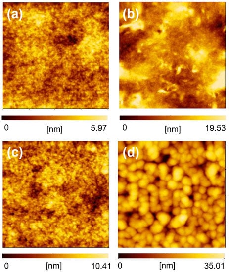 In this paper, we describe the AFM analysis of the microstructures of BHJ layers composed of NFAs (EH-IDTBR [22,23] and ITIC [24,25], Figure 1c) and donor polymers with a benzodithiophene unit (PTB7 [26,27] and PBDB-T [28,29], Figure 1d) after removing the NFAs by the selective extraction method. We examined utility of various organic solvents in the selective extraction method of the above materials by using donor/NFA blend films (donor/acceptor weight ratio is 1:1). Then, we studied the microstructure of the BHJ layer composed of EH-IDTBR and PTB7 by the selective extraction method and subsequent AFM analysis, which offered important knowledge in the pursuit of high photovoltaic performance.