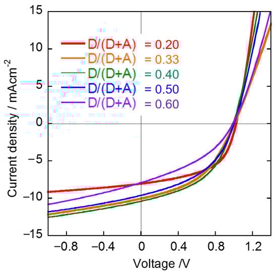 We fabricated OSCs with an inverted structure, which can be readily fabricated and have high device durability. Indium tin oxide (ITO) electrodes on glass substrates were washed by ultrasonication in isopropanol, cleaned in boiling isopropanol, and dried by nitrogen flushing. A zinc oxide (ZnO) film was prepared by the sol-gel method reported in our previous work [30]. Zinc(II) acetylacetonate hydrate (95 mg) was dissolved in 2-methoxy ethanol (1.0 mL) containing a small amount of acetylacetone. The solution was spin-coated onto the washed ITO electrodes at 1000 rpm for 60 s. After spin coating, the precursor films were annealed for 60 min under ambient conditions. The resulting ZnO layer (ca. 30 nm) was cleaned with isopropanol. A donor/acceptor mixed chlorobenzene solution (18 mg mL−1) was spin-coated onto the glass/ITO/ZnO films. A PEDOT:PSS dispersion in water was spin-coated onto the active layer (1200 rpm, 60 s). Film thicknesses were ca. 100 nm for the active layer and approximately 150 nm for PEDOT:PSS. An Au back electrode of approximately 100 nm thickness was prepared by vacuum deposition at 2 × 10−5 Torr onto the PEDOT:PSS layer. Finally, the device covered with sealing film (Cellel, Kureha Extech) was thermo-compressed at 30 N m−2 for 30 s. All fabrication steps except the Au deposition step were performed in an N2-air mixed atmosphere to control the relative humidity to less than 30%.