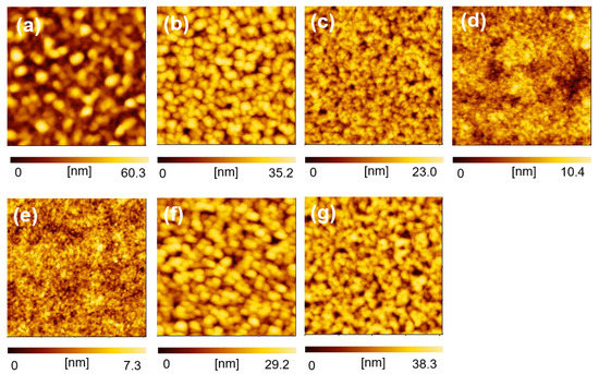 AFM images of BHJ films composed of PTB7:EH-IDTBR after BGE washing (2 μm × 2 μm). D/(D + A) ratios of PTB7:EH-IDTBR are as follows: (a) 0.20, (b) 0.33, (c) 0.40, (d) 0.50, (e) 0.60, (f) 0.33 with 1 vol% nitrobenzene, and (g) 0.33 with 2.5 vol% nitrobenzene.