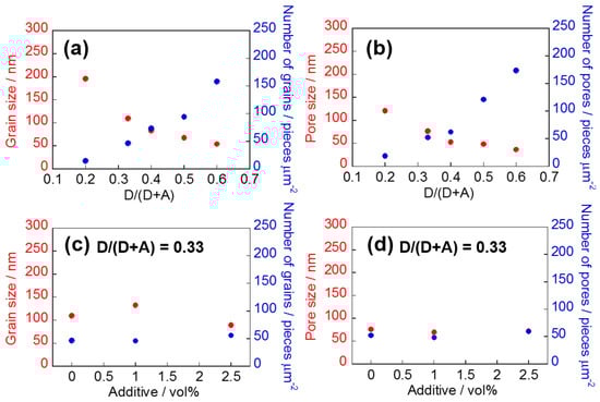 Dependence on D/(D + A) ratio (D: donor, A: acceptor) of grain/pore size (averaged values) and number of grains/pores (pieces μm−2) (a,b). Dependence on additive amount of grain/pore size and number of grains/pores (c,d).